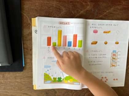 これまで学習してきたことを復習しています。数を数えたり、数字を順番にたどったりしました。ほかにも形やさくらんぼ計算も復習しました。