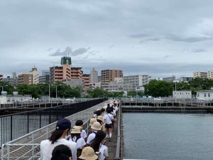柴島浄水場をじっくり見学しました。今日まで、社会科の学習で、学校のプールの水の量や水道料金、大阪市の3つの浄水場や、1日あたりの水道使用量の学習をしていました。浄水場では、楽しい動画を見てから各施設を見学しました。雨もやんでいてよかったです。