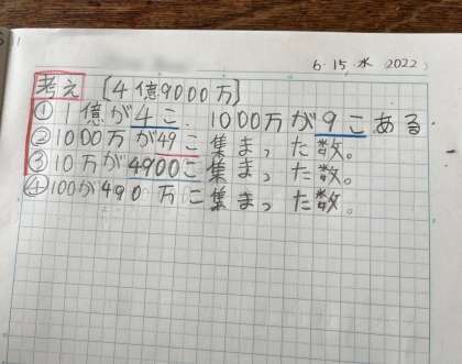 大きな数の学習をしています。今日は大きな数をいろいろな読み方で表すことについて調べました。4億9000万という数は、「1億が4つ、1000万が9つ」と表すことができます。この他にどんな表し方があるか、ノートにどんどん書き出していきました。