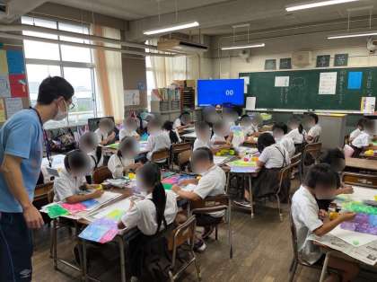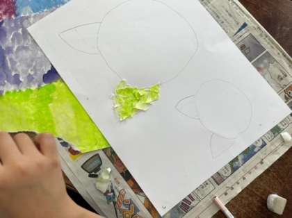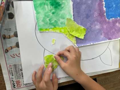 あじさいづくりをしています。水彩絵の具でグラデーションをつけて塗った紙をちぎって、あじさいの貼り絵に仕上げていきます。色の違いや重なりに気をつけながら、上手に貼っていくことができました。