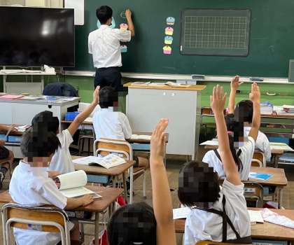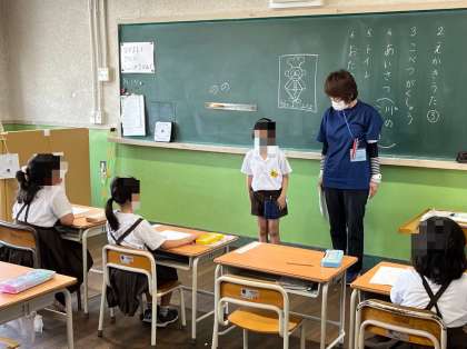 1年生は算数で「あわせていくつ」の学習をしていました。実際に黒板に絵カードをはって、視覚的にもわかりやすくしていました。