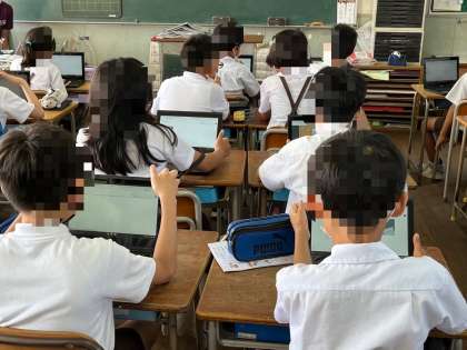 5年生は、タブレットを使って学習の振り返りをしていました。何かを調べたりするだけでなく、いろいろなことに活用できます。