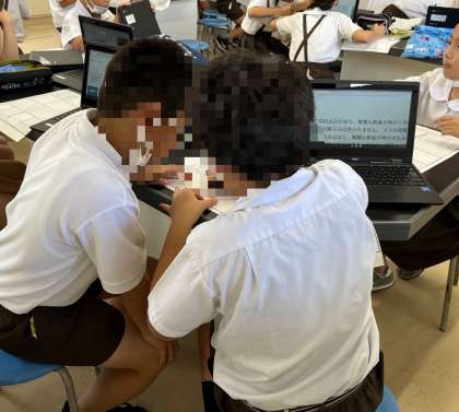 5年生は、理科室でタブレットを使って、調べ学習をしながら「めだか新聞」をつくっていました。