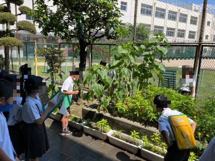 4年生は、理科で、植物の観察をしていました。ひまわりなどは、もうとても大きくなっていて、4年生の子どもたちと変わらないぐらいの高さになっています。花が咲くのが楽しみですね。