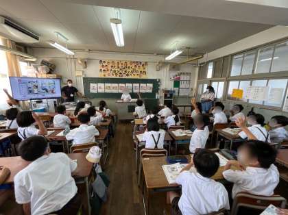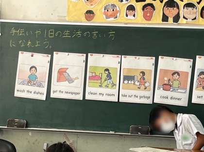 2学期最初の英語の学習です。今日は手伝いや1日の生活の表現の仕方を学習しています。「お皿洗い」や「部屋の掃除」「犬の散歩」など1日の生活ですることはたくさんありますね。子たちとジェスチャーゲームをしながら、1日の生活の何をしているか、それは英語ではどのように表現するかに親しみました。