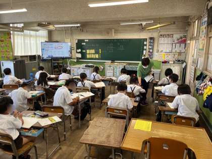 算数科の学習です。くり上がりのあるひっ算の仕方を考えていきました。位をそろえてひっ算に書くことや、一の位から計算していくことなど計算の仕方に注意しながらしっかりひっ算をすることができました。先生からまるをもらうと子どもたちは大喜びです。