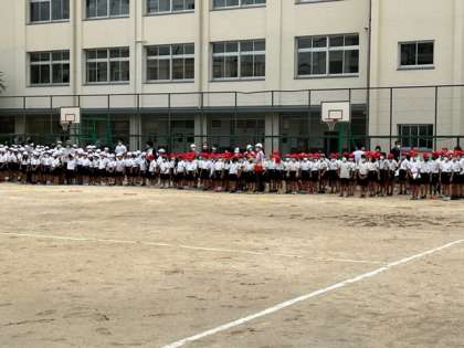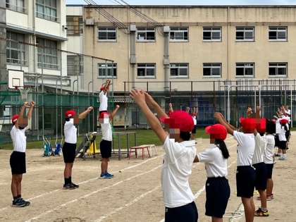 1時間目は全校児童で、運動会の全体練習を行いました。開会式への入場やラジオ体操等を行いました。ラジオ体操は、運動委員会の児童が、全校児童の前で見本を見せてくれました。