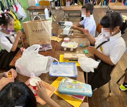 2年生は、生活科で「動くおもちゃ」を制作していました。グループで友達の意見も参考にしながら、食品トレーやお菓子の空箱などいろいろな材料を活用しながら、思い思いの作品に仕上げていました。