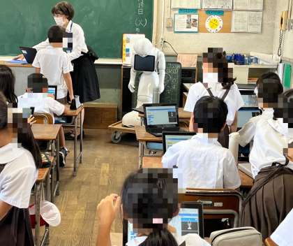 3年生は、pepper君を活用しながら、プログラミング学習を行っていました。ICT支援員の方にもアドバイスを受けながら頑張っていました。5年生も一人一台のタブレットでteamsを活用していました。
