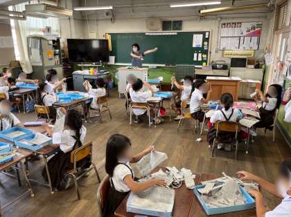 1年生は、図工の学習で新聞紙をちぎりました。はさみのように真っ直ぐ切れないけど、手でちぎるとおもしろい形になることに気づきました。