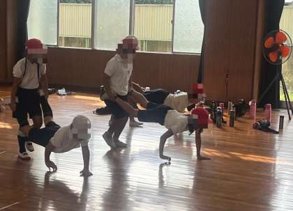 3年生は、体育館で体育の学習をしていました。「手押し車」など体つくりの基礎になる運動に一生懸命取り組んでいました。