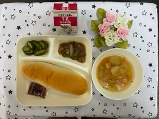 1年生の教室を見に行くと、「今日のスープの味がめっちゃおいしい!」「きゅうりおかわりしたよ!」「ぜんぶ好きなメニュー!」などなど、たくさん教えてくれました☆
