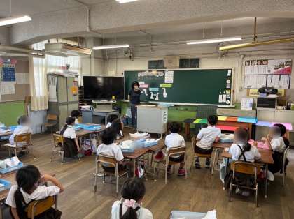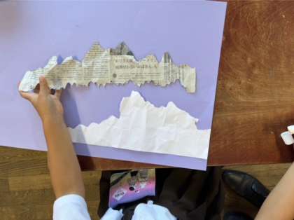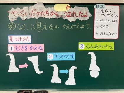 図工の学習です。「やぶいたかたちから〇〇がうまれたよ」というテーマで作品をつくりました。やぶった紙や新聞紙の向きを変えたり、裏返したり、組み合わせたりして何に見えるかイメージしました。子どもたちに「何に見える?」ときくと、「ぼうし」「おにがしま」等、それぞれがイメージしたものを教えてくれました。