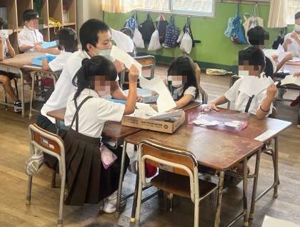 5年生も、算数で、少人数のクラス分かれて、直角三角形の面積の求め方について学習していました。実際の三角形を切ったり、はったりしながら求め方について話し合っていました。