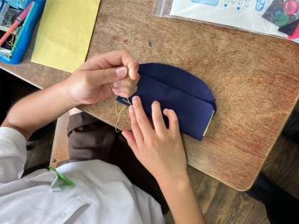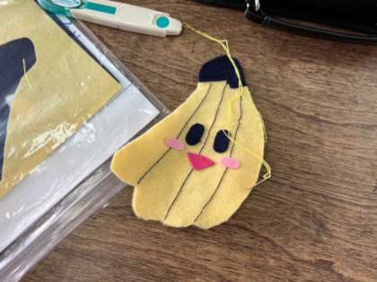 家庭科では、ソーイングの学習です。それぞれが工夫とアイデアを凝らして、フェルトを縫い合わせて小物を制作しています。とっても上手です。