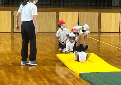 1年生は、体育でマット運動を行っていました。手の付き方等に気をつけながら、「後回り」に取り組んでいました。