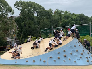 お楽しみの幸せお弁当をいただいた後は、思いっきり遊びました。すり鉢滑り台は、大人気でした。広場では、おにごっこや、大なわ跳びや、ドッジボールをしました。