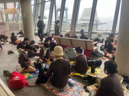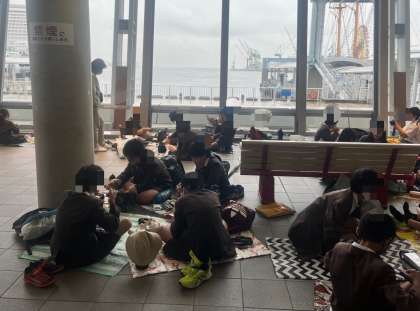 雨が降っているので、施設の方のご厚意で特別に室内で食べることができました。港の眺めもよく、朝早くから作っていただいたおいしいお弁当にみんな笑顔です。