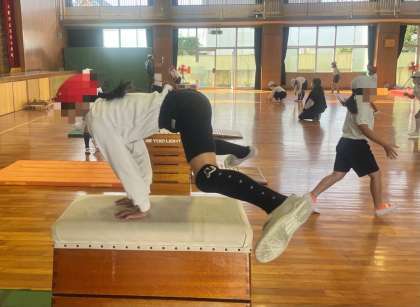 3年生は、体育で、跳び箱運動をしていました。跳び箱に手をつく位置や、踏み切りの仕方などうまく飛び越すにはどうしたらいいかを考えながら、取り組んでいました。