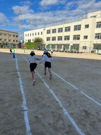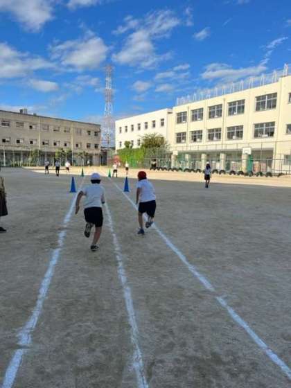 体育の学習です。今日は、秋の体力テストに向けて50メートル走を練習しました。短い距離から徐々に長さを広げていき、50mを全力で走りきる練習をしました。子どもたちは、何本も夢中になって走っていました。