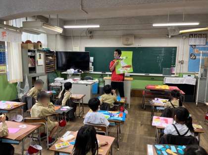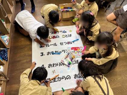 2年生は、生活の時間です。近隣の幼稚園や保育所の園児を招いて「おもちゃランド」を計画しています。学級のみんなで協力して招待状やプログラムを作りました。