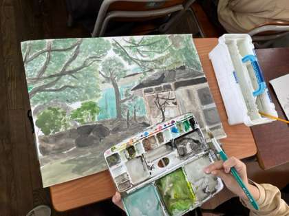 6年生が図工の学習で、校舎の絵を描いていました。色付けで、水を混ぜて色の濃淡を出すことで、絵にぐっと奥行きがでてきました。