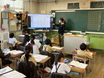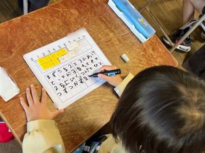 1年1組は国語で様子をあらわす文を書く練習をしています。自分が見たことについて見た日や場所、ものなどを文章に書きます。マス目の使い方を先生から教わりながら書く練習をしました。