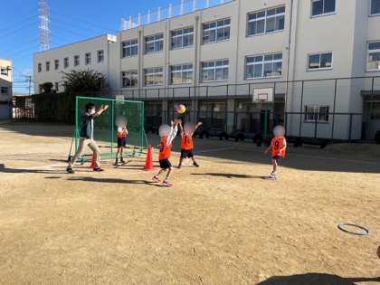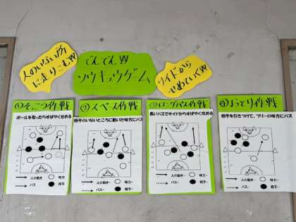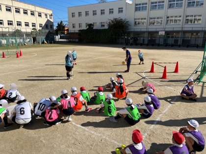 3年生は運動場で体育の学習です。ゴール型ゲームの練習にも慣れてきました。学級でも色々な作戦について話し合いました。練習では、人にパスを出すのではなく、スペースを上手く使ったパスが出せるようにチームで練習をしました。