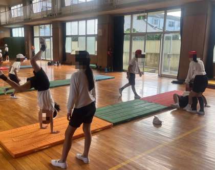 4年生は、体育でマット運動に取り組んでいました。逆立ちやブリッジをしたりと体の調整力を身につける活動に取り組んでいました。
