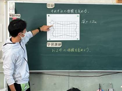 今日は、体積を求める問題なのですがいつものように直線だけでできた形ではありません。深さが1.2mあるいびつな形のプールです。子どもたちは、まず底面積を求めるためにマス目をもとにおよその広さを調べていきました。