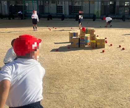 1年生は、体育の学習で紅白玉を使って、ゲームをしていました。的当てをしたり、お互いに投げ合ったりしながら活動していました。