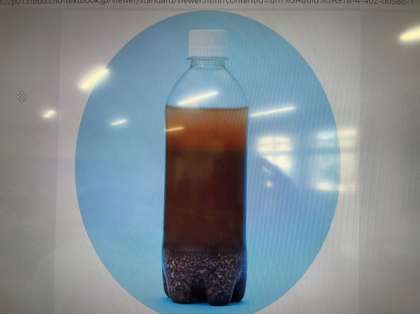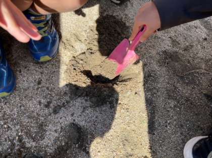 地層がどのようにしてつくられるか実験します。理科室で予想を立てた後は、外に出てペットボトルに土を入れました。これに水を入れてよくふり、どのように土が堆積していくかを調べていきます。