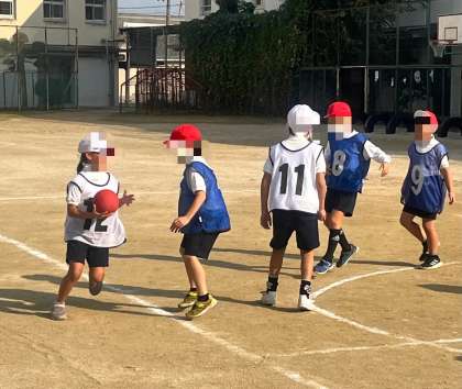 2年生は、体育で、ボールゲームを行っていました。敵がいないところを見つけて動いたり、敵のマークを外したりなど、上手く動きながらゲームを進めていました。