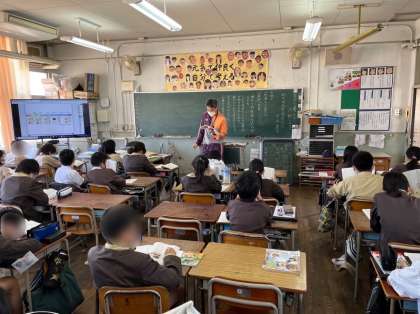 5年生は国語の学習です。説明文「和の文化を受けつぐ」では、筆者は色々な資料を用いて自分の考えに説得力を持たせています。今日は、その資料の効果について考えます。年表やイラスト、写真を使って説明することでどんな効果があるかについて意見交流しました。