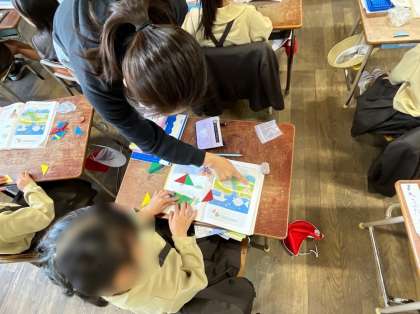 1年生は形づくりの学習です。教科書のお手本と同じ形をつくるには、タイルをどのようにしきつめていくといいでしょうか。実際にタイルを操作しながら考えました。お手本と同じ形ができると、「できた!」という声があがりました。