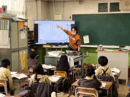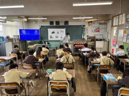 1年生は、国語科「すきなきょうかはなあに」の学習です。自分の好きな教科を二つ選んで、その教科名と理由をお友だちに紹介します。先生から、文のまとまりを段落で分けることを教わり、下書きの練習をしました。