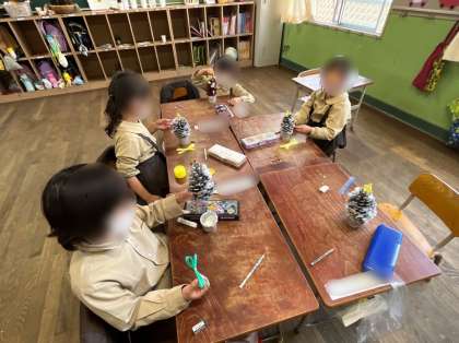 1年生は松ぼっくりを使って、クリスマスツリーを作っています。綿やキラキラの星などをつけて、上手に飾り付けができました。