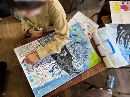 3年生は国語科で学習した「モチモチの木」の場面を描いています。モノクロの陰影にところどころ色を加えることでとても味わいのある作品になっています。