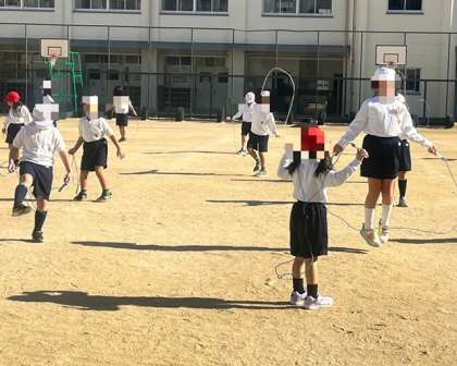 1年生は、体育で短なわ跳びに取り組んでいました。いろいろな跳び方に挑戦しています。