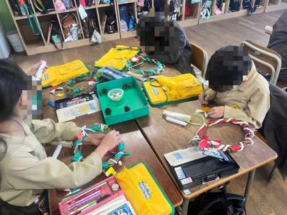 2年生は、リース作りをしていました。まつぼっくりに色を付けたり、折り紙で飾りを作ったり、いろいろな工夫をしていました。