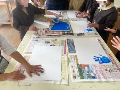 1年生は150周年のお祝いで活用するかざりを製作していました。みんなの手形を画用紙に写して、さて何ができあがるかは、後日のお楽しみということで。
