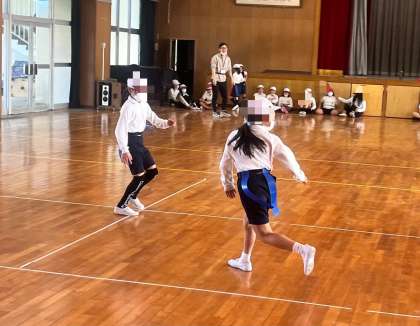 3年生は、体育で「鬼ごっこ」をしていました。腰につけたタグを取られないようにうまく逃げながら、相手のタグをとるところが面白さであり、難しさです。