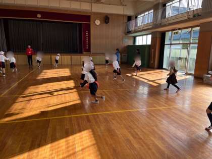 1年生は、講堂で体育の学習です。「おにあそび」でしっぽとり鬼ごっこをしました。しっぽのタグをつけると子どもたちは、取られないように必死で逃げ回りました。