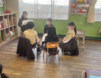 1年生は、国語科の学習です。いろいろな昔話を学習しましたが、今日は自分が作ったお話を友だちと交流しました。とても楽しくて、おもしろい話ばかりでした。