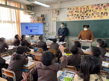5年生は英語の学習です。ミッシングゲームをしながら、人の紹介する英語表現について練習しました。