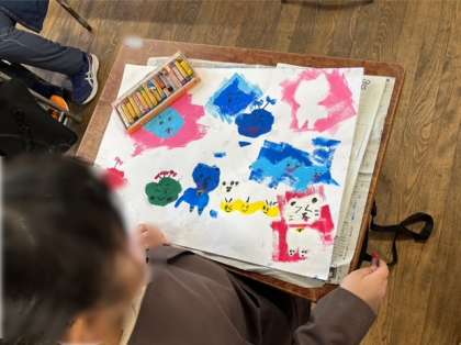 2年生は図画工作科の学習です。自分の好きな模様の型紙を作って、模様を写し取り、そこにパスで絵を描き加えました。とても上手です。