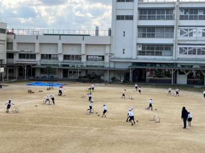 1年生は、体育科の学習でボール運動をしています。サッカーボールを足で転がして、ハードルのフレーム内にボールを通すと1ポイントというゲームをしました。