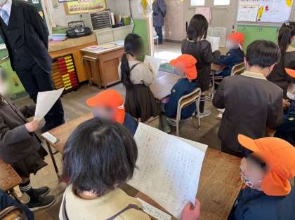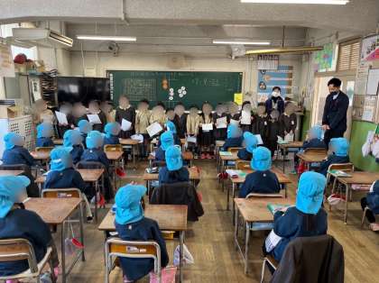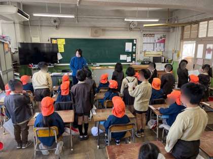 伝法幼稚園の園児が小学校の1年生の学習の様子を見学に来ました。1年生の児童は、学校生活について丁寧に園児に紹介しました。4時間目の学習の後は、給食の様子も見学してもらいました。