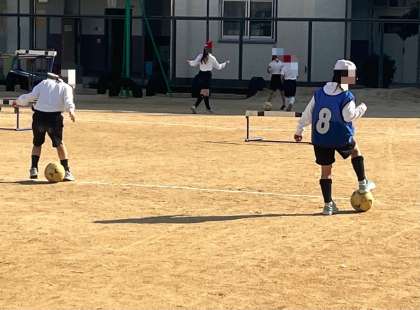 1年生は、体育の学習で、ボール蹴りをしていました。どうすればボールを蹴りながら前へうまく進めるか、考えながら活動していました。