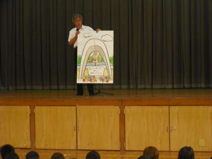 始業式では校長先生から新しい先生や事務職員さんの紹介があった。そして、手作りの広島の平和記念公園の慰霊碑の絵を見せてくれた。平和の大切さや日本の代表として平和についてお話しするときがあるかもしれないので、よく勉強しておいてほしいとお話しされた。とっても大切なことだからもう一度考えてみよう。